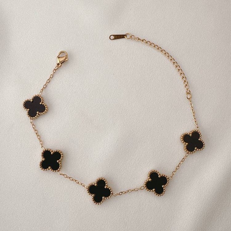 دستبند ون کلیف استیل طلایی سنگ مشکی ۵ گل