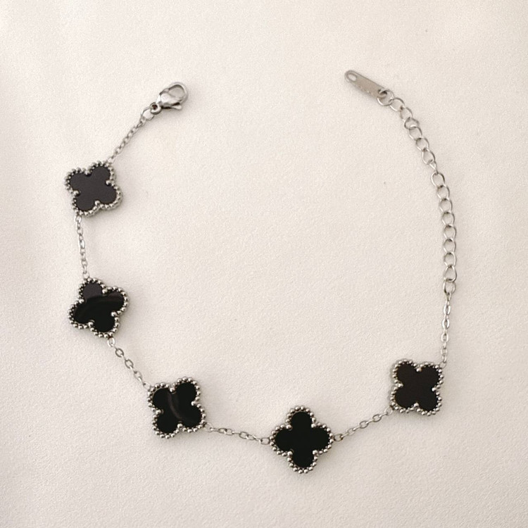 دستبند ون کلیف استیل نقره ای سنگ مشکی ۵ گل